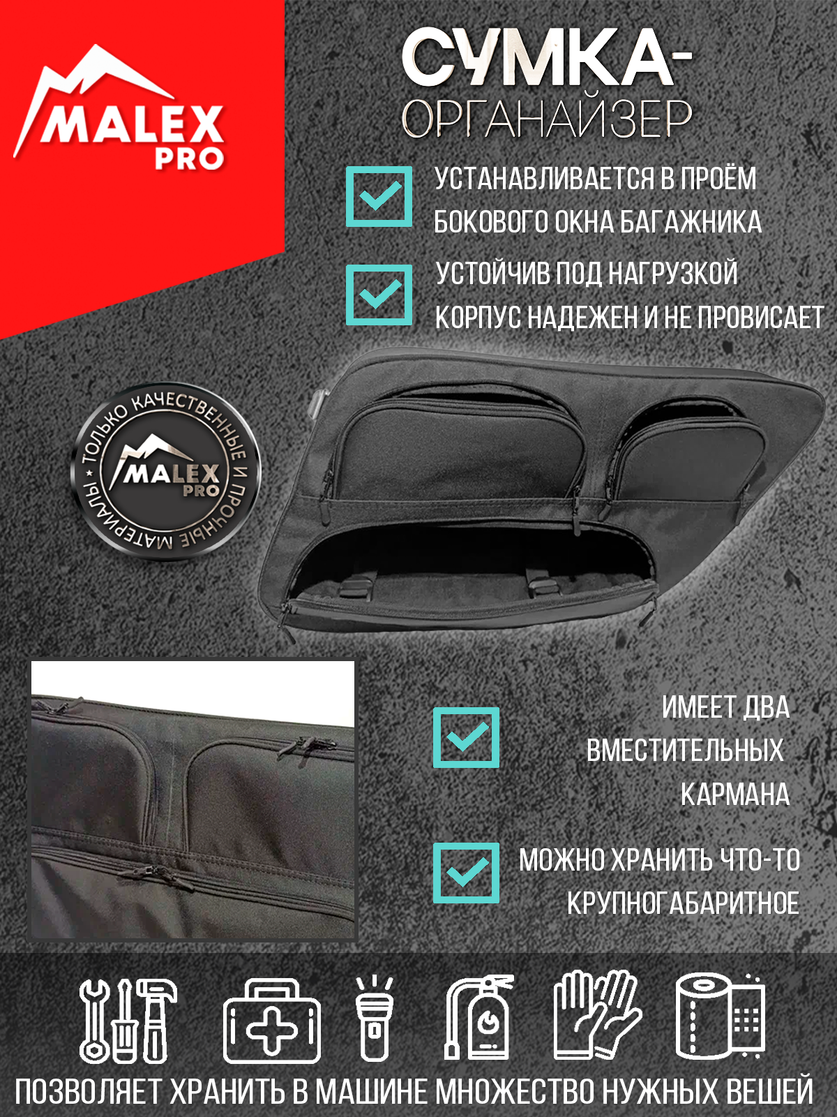 Сумка-органайзер устанавливается в проём бокового окна багажника. Заполняет весь проём бокового окна;