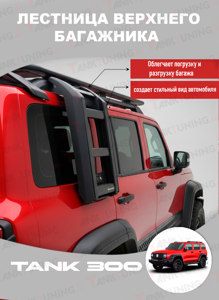 Универсальная боковая лесенка багажника предназначена для легкого и удобного доступа к верхней грузовой платформе вашего Tank 300. Облегчает погрузку и разгрузку багажа, а так же создает стильный вид автомобиля.